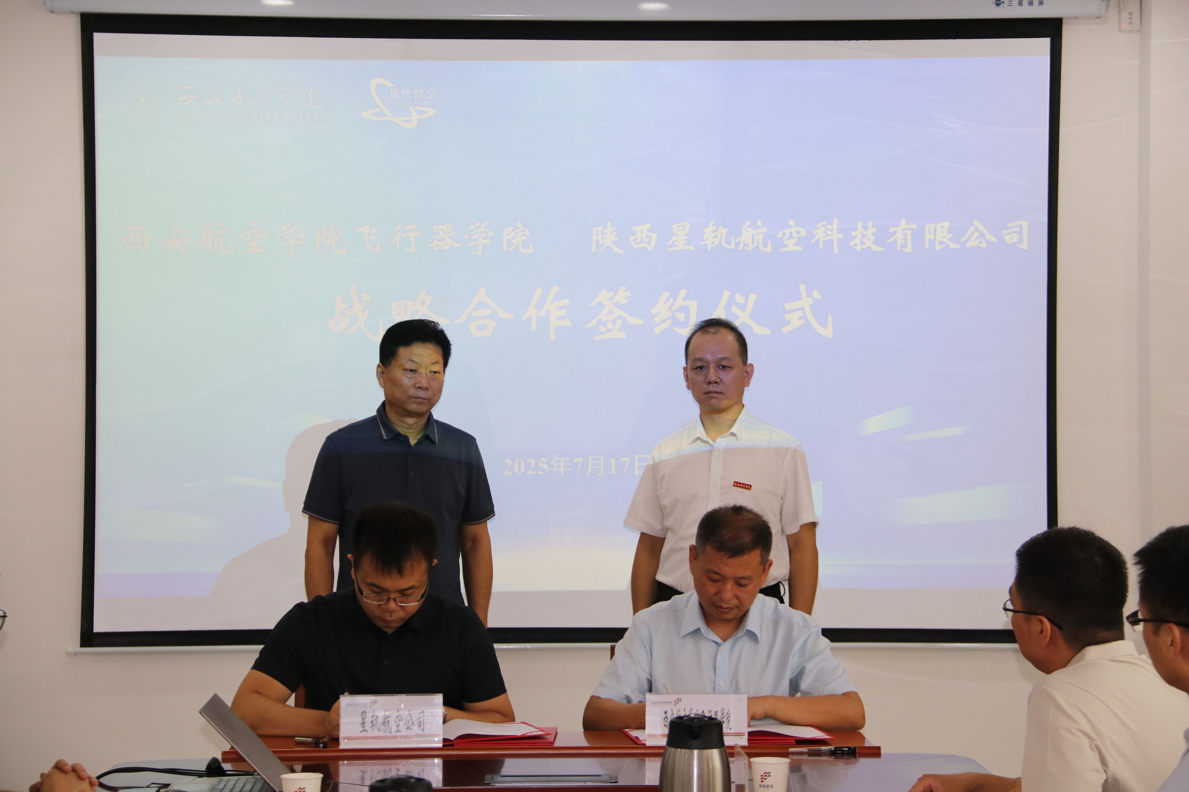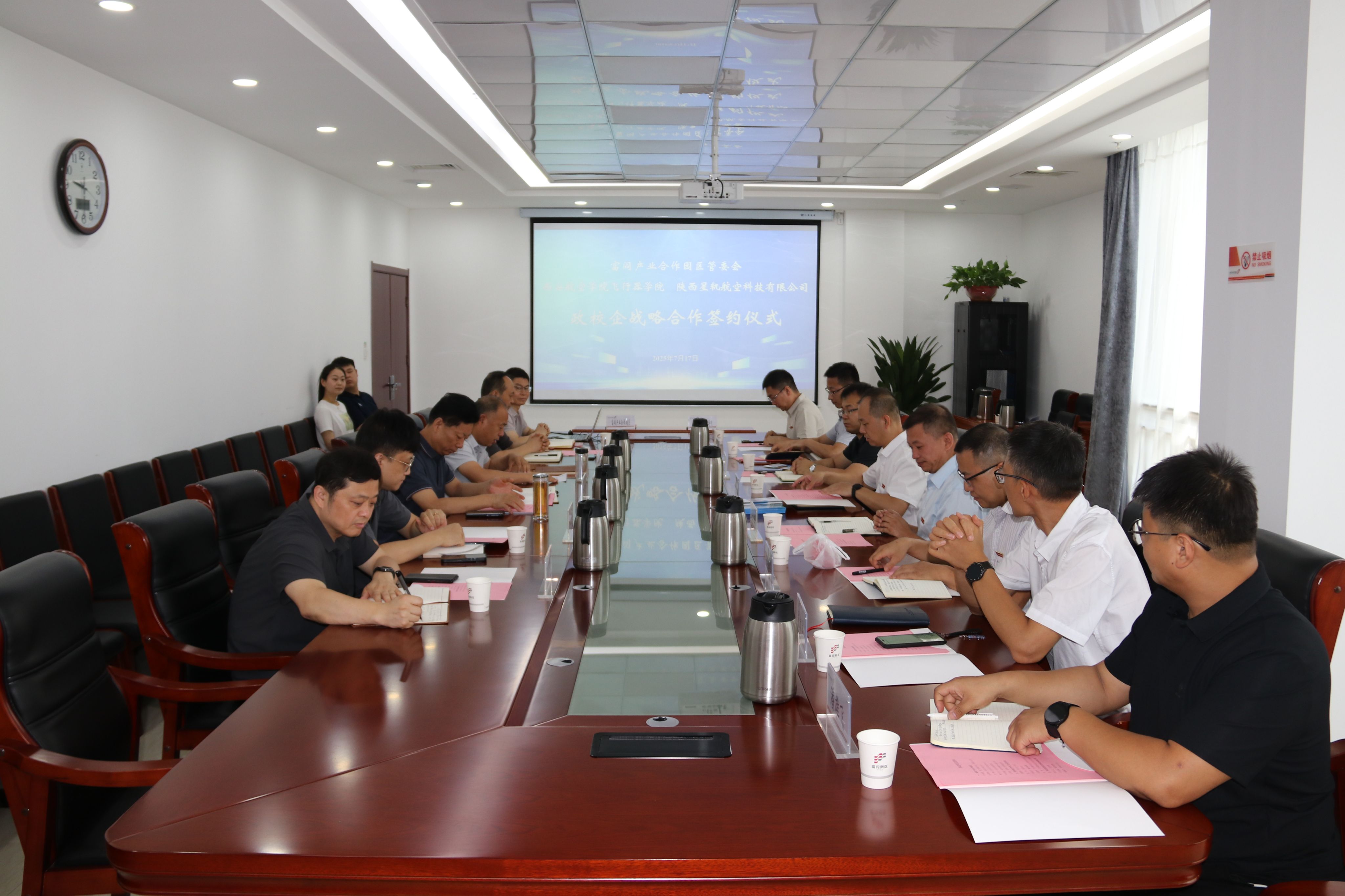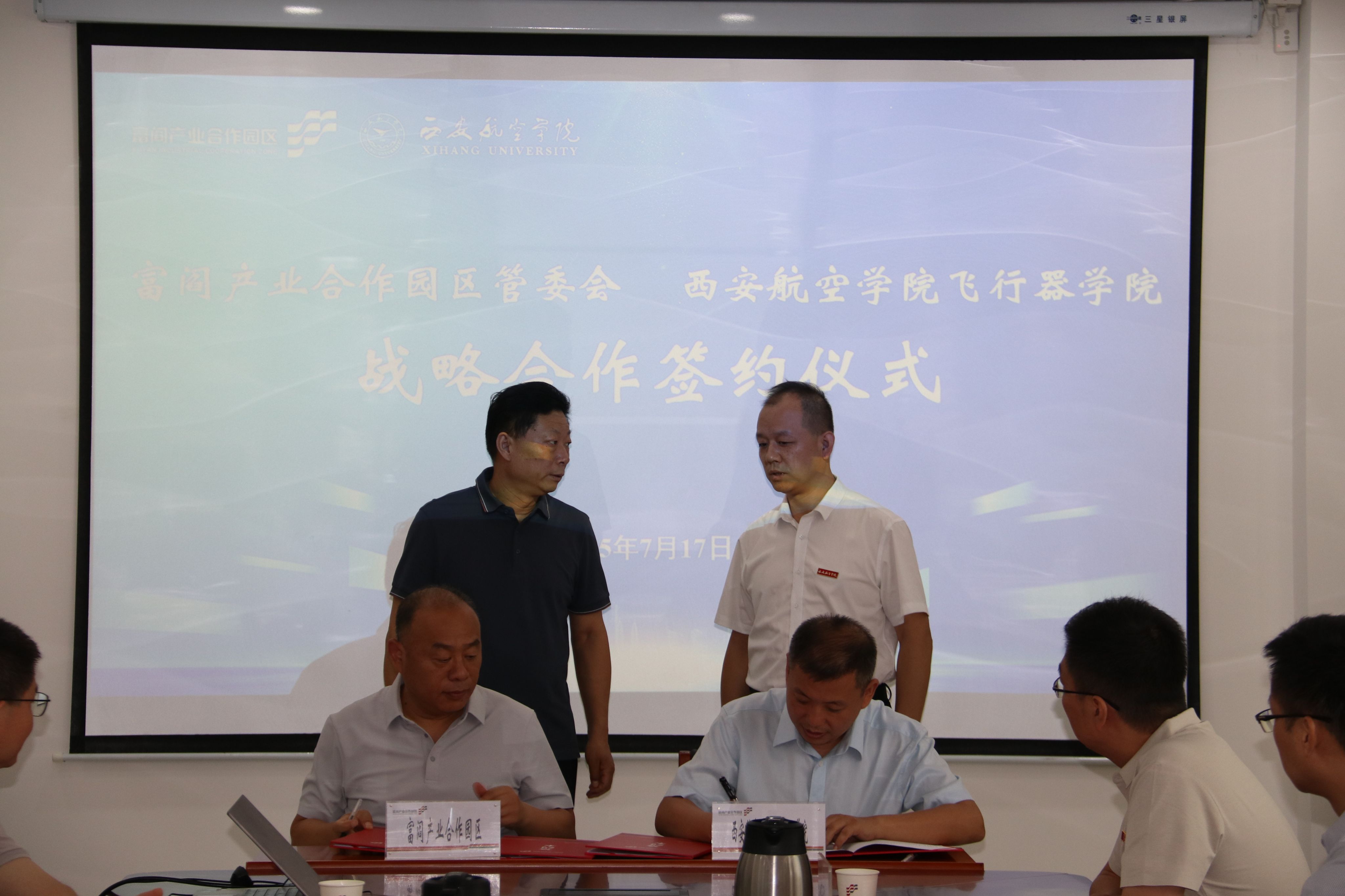 2025年7月17日飞行器学院刘建强一行赴富阎产业合作园区交流座谈并举行合作签约仪式。出席签约仪式的有富阎产业合作园区党工委副书记/管委会主任杜银虎、管委会副主任张景龙、党群工作局负责人王一鹏、经济发展局局长黄永利、科技创新中心副主任刘松舰、党群工作局副局长王图忠、飞行器学院党总支书记刘建强、副院长侯伟、院长助理/教工党支部书记谯盛军、飞行器动力工程专业负责人张建华、飞行器制造教研室专任教师李伟、陕西星轨航空科技有限公司总经理库大山、副总经理冷冠磊、综合办主任潘雄飞。